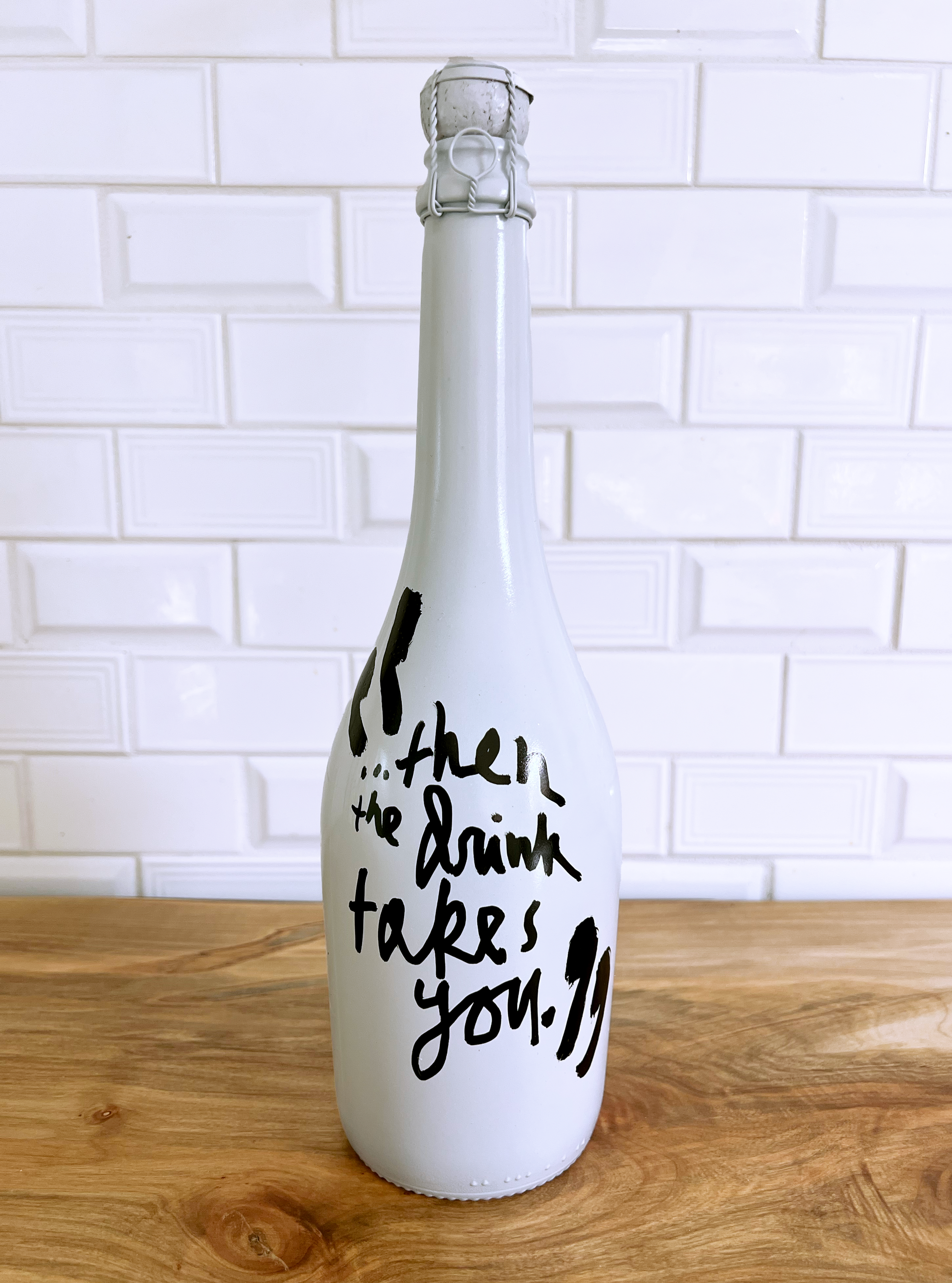 To celebrate my own sobriety and urge you on yours, I’ve begun drawing on wine and champagne bottles of various sizes and various brands. I want to support you and cheer you on to begin your own boring but sober path.